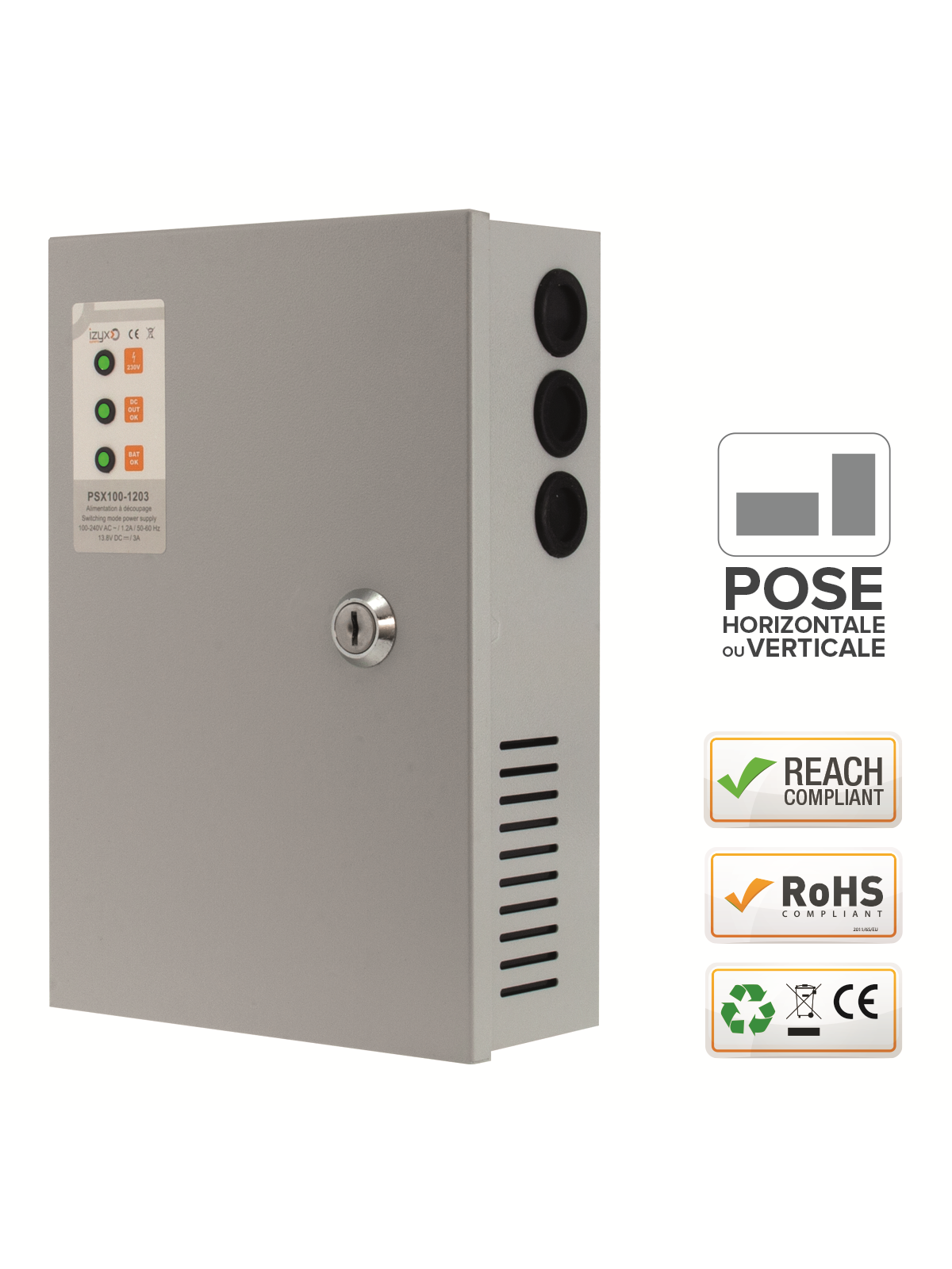 Alimentation à découpage- Secourue- 12V/5A ou 24V/2.5A- Coffret métal- Voyants- Autoprotection- Sans batterie