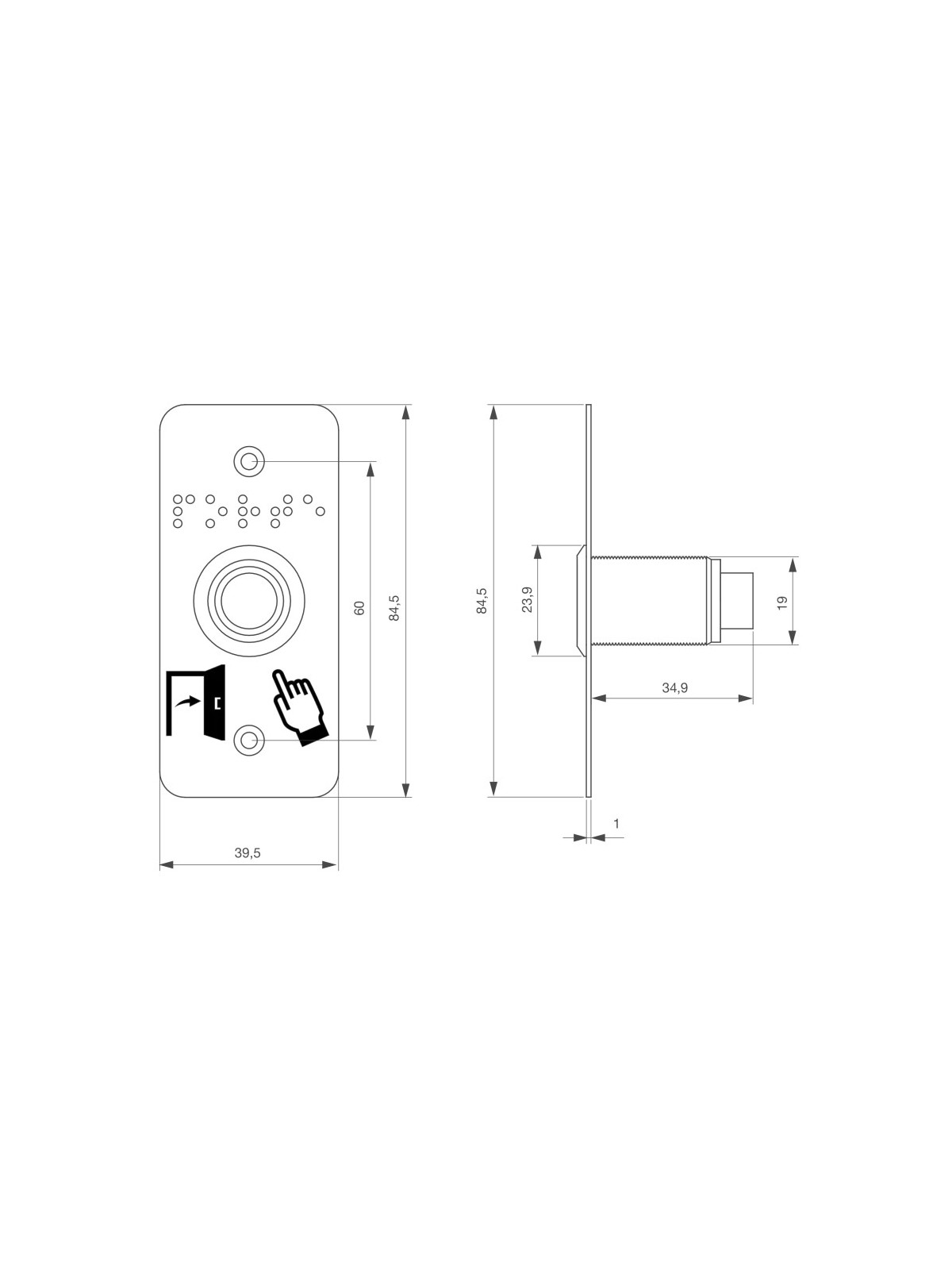 Bouton poussoir inox lumineux. NO/NF. 19 mm. Bornier à vis. Plaque inox 84 x 39 mm. Pictogrammes "PORTE"+''MAIN''+ braille.