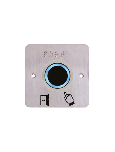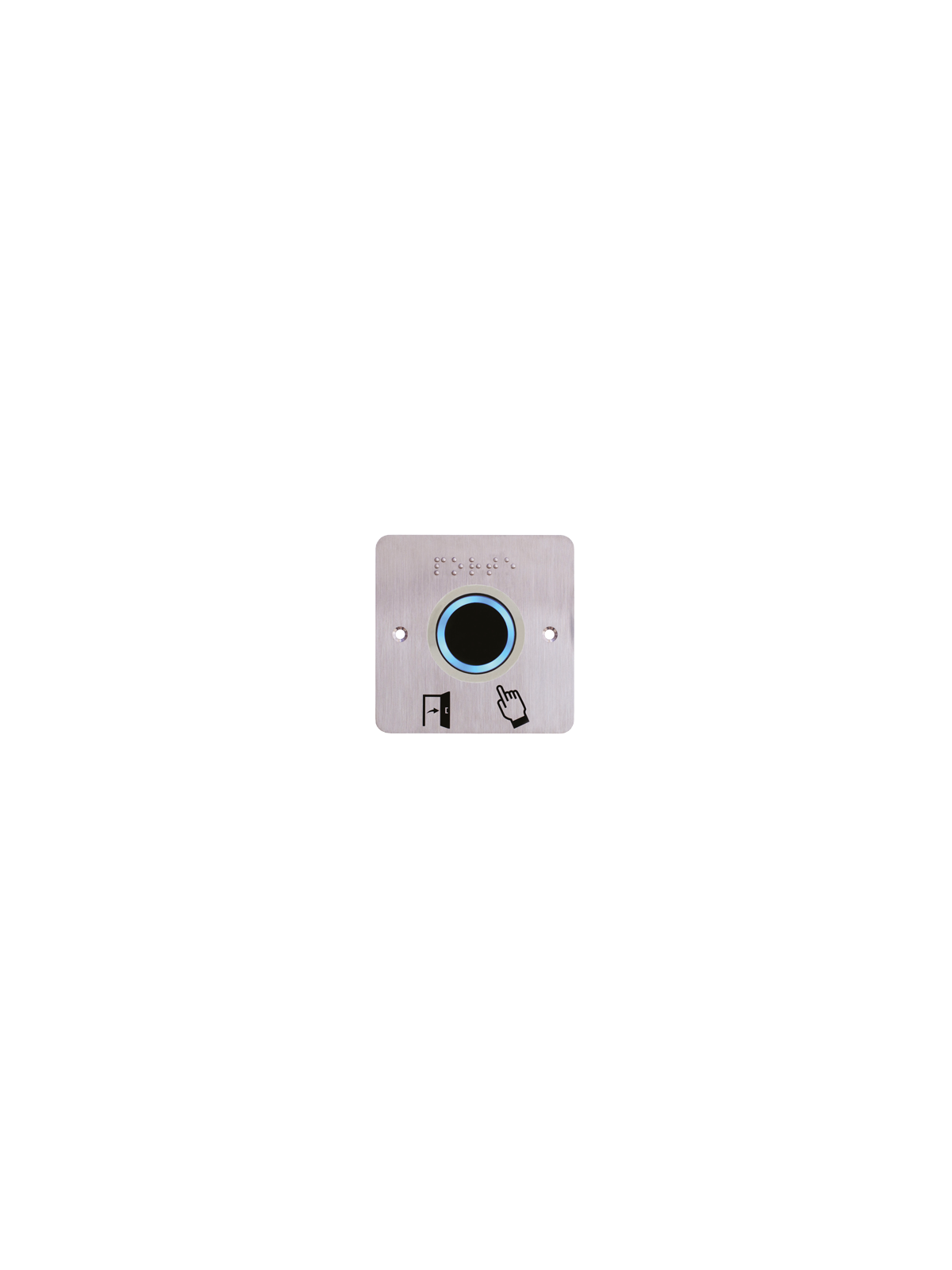 Bouton poussoir. Capteur Infrarouge IRS, Ø 38 mm. 12/24V DC. Halo bleu/vert. Buzzer. Relais temporisé + Plaque acier inox SSP231. 80 x 80 mm. Perçage Ø 38 mm. Pictogrammes "Porte + doigt" et "PORTE" en braille.