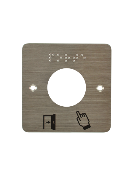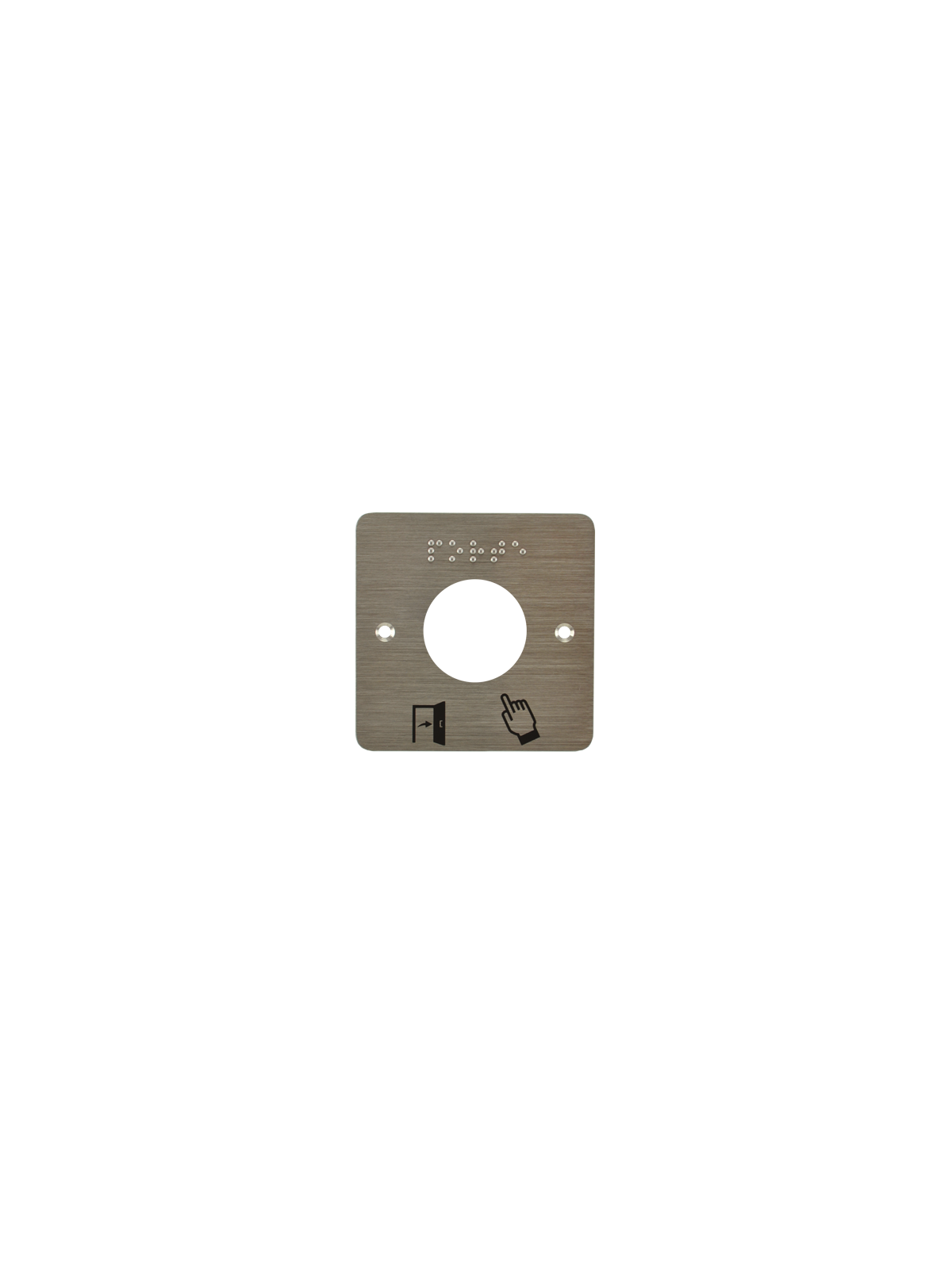 Plaque inox 80 x 80 mm. Symbole clef + braille. Encastré / Pour bouton poussoir diamètre 19 mm.