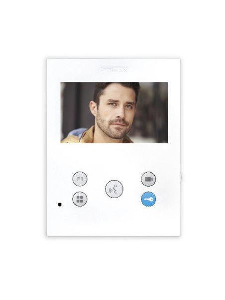 Moniteur mains libres VEO-XS. Il se caractérise par sa petite taille et son épaisseur, extra-plat. Grâce à son menu OSD et à la disposition des boutons, son interaction avec l'utilisateur est simple et intuitive. Fabriqué en plastique ABS résistant aux chocs. Fini texturé pour un nettoyage facile et une protection UV pour le rendre plus résistant à la lumière du soleil. Le VEO-XS est doté d'un écran large couleur de 4,3 "(16: 9). Son design équilibré aux lignes épurées est distinctif, moderne et minimaliste. Le VEO-XS se fond dans l'environnement. Lorsqu'un appel arrive, l'image apparaît automatiquement. Lorsque le bouton de conversation est enfoncé, la conversation avec le visiteur commence. L'image disparaît automatiquement au bout de 90 secondes ou lorsque le bouton est à nouveau enfoncé. Pour ouvrir la porte, appuyez sur le bouton de la touche.
