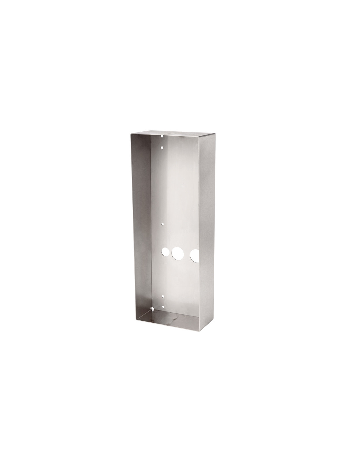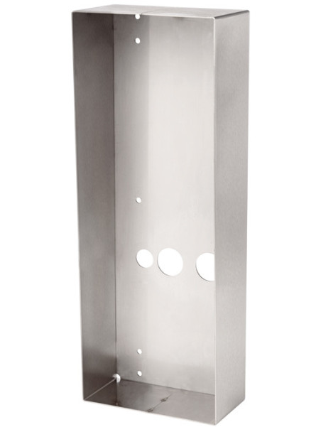 Cadre saillie inox avec visière anti-pluie pour platine vidéo 1 bouton d'appel JPDVFLBM avec pictogrammes lumineux et synthèse vocale. Avec boucle magnétique. Cadre saillie inox avec visière pour JPDVFLBM.