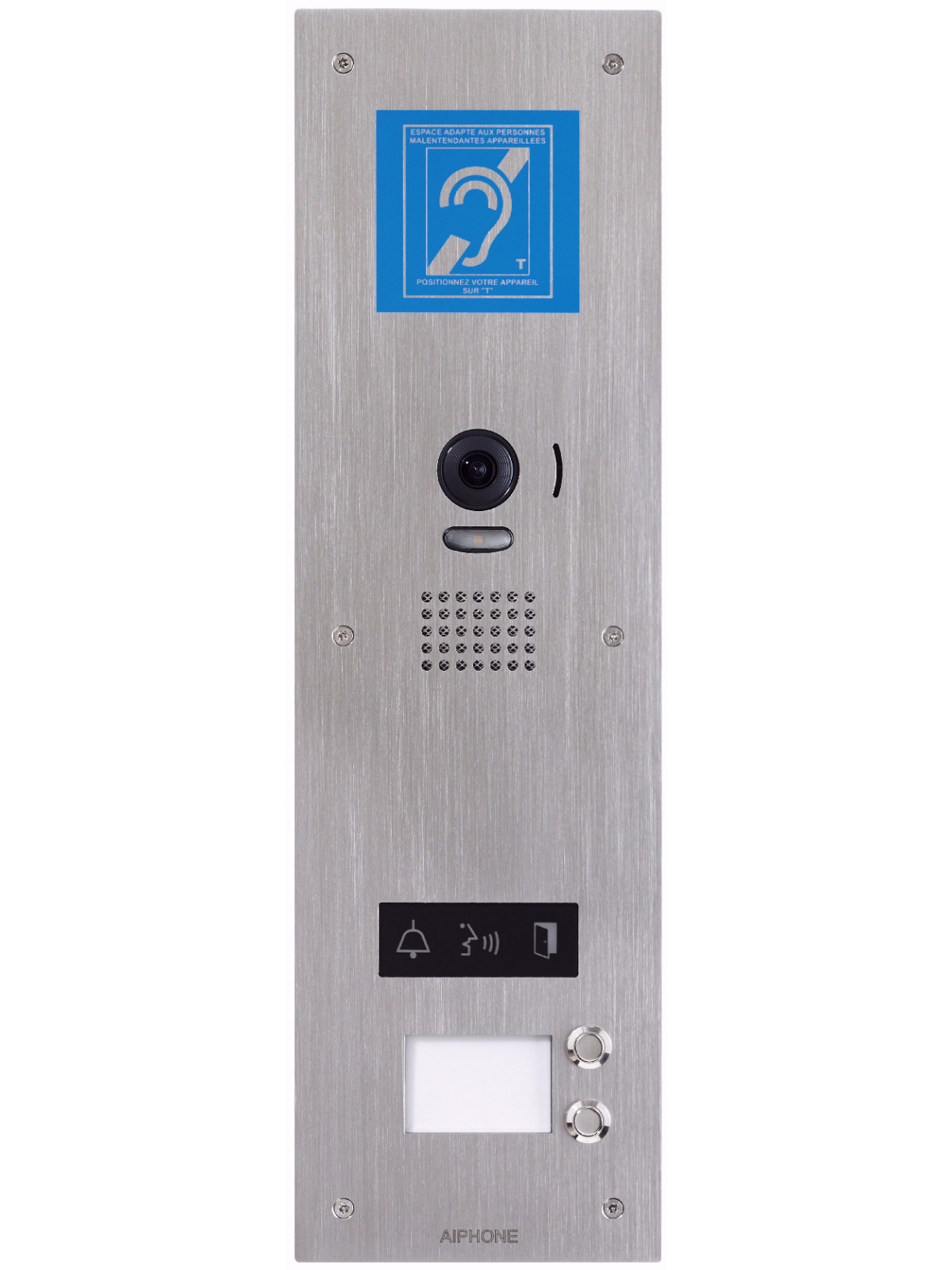 Platine vidéo inox encastrée 2 BP avec synthèse vocale, pictogrammes lumineux et boucle magnétique pour gamme JP.