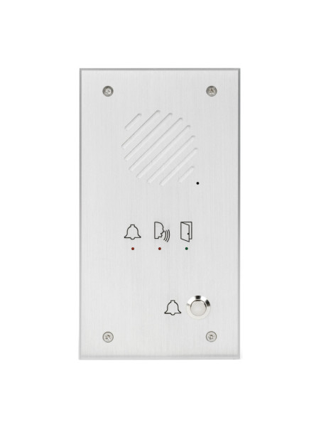 Platine de rue téléphonique aluminium encastrable. 2 boutons d'appel. Synthèse vocale. 2 numéros jour et 2 numéros nuit. Clavier codé.