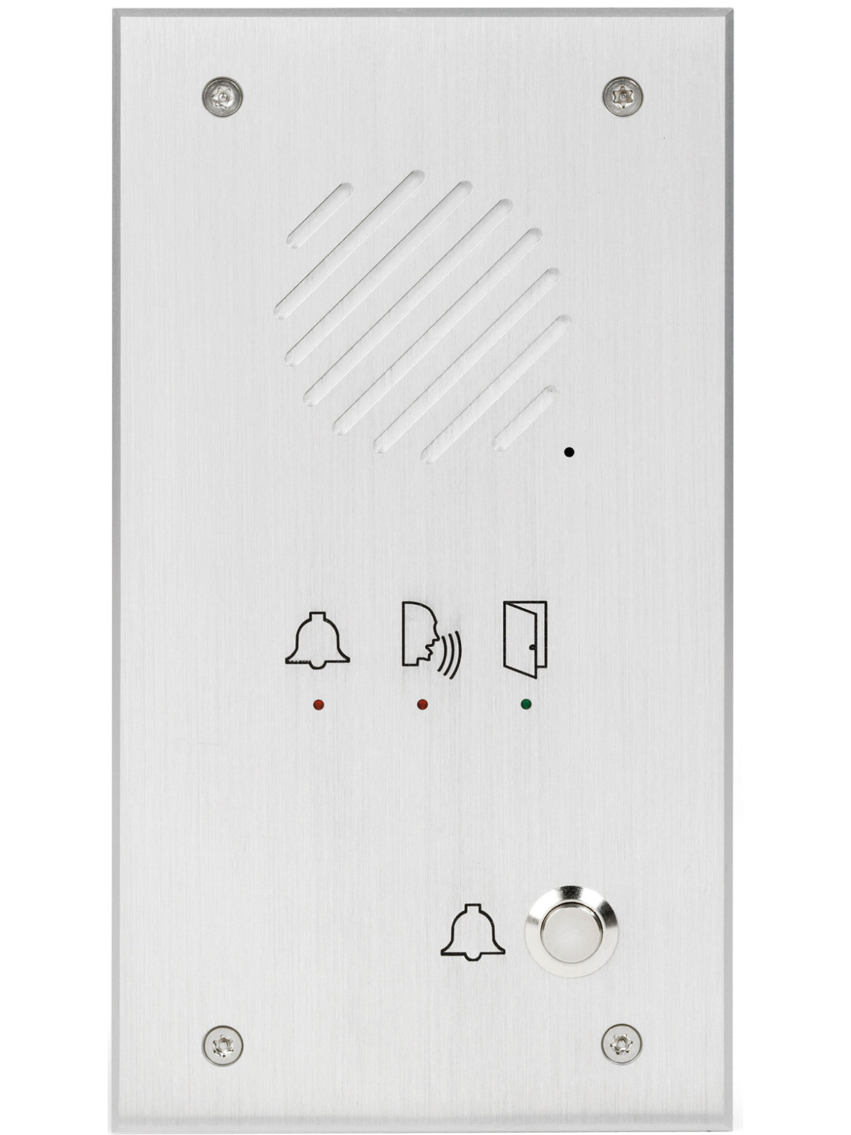- Voyants x 3 associés à 3 pictogrammes visuels appel en cours, parler = voyant orange / ouverture porte = voyant vert), doublés de la synthèse vocale