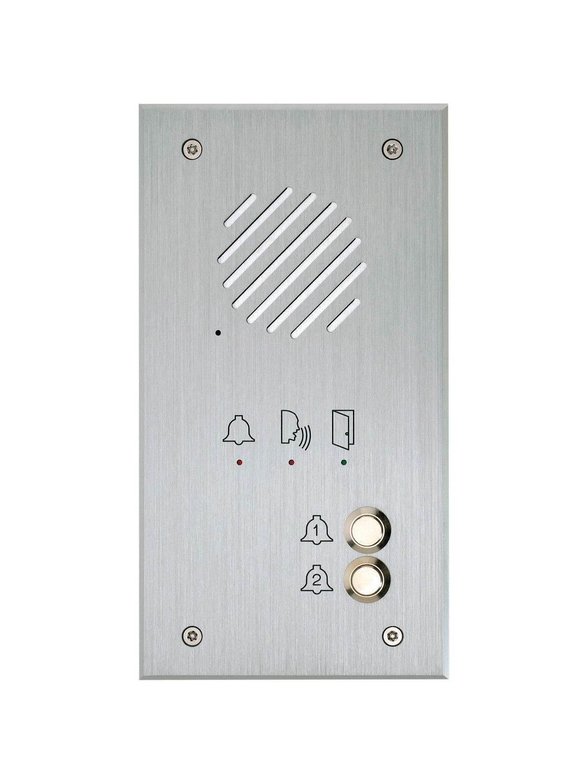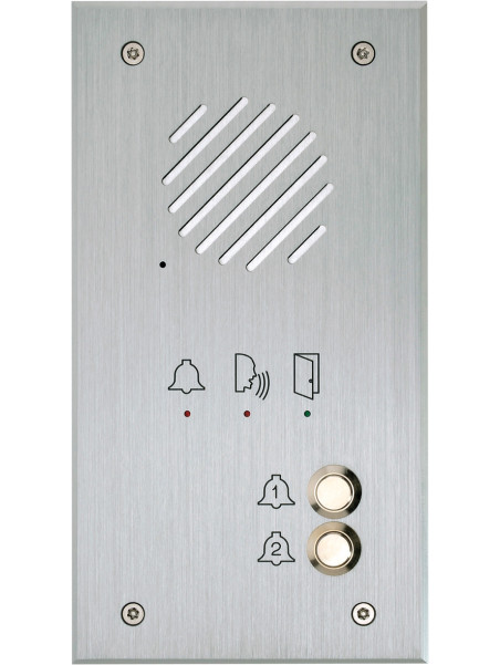 Platine vidéo inox encastrée 2 BP avec synthèse vocale, pictogrammes lumineux et boucle magnétique pour gamme JP.